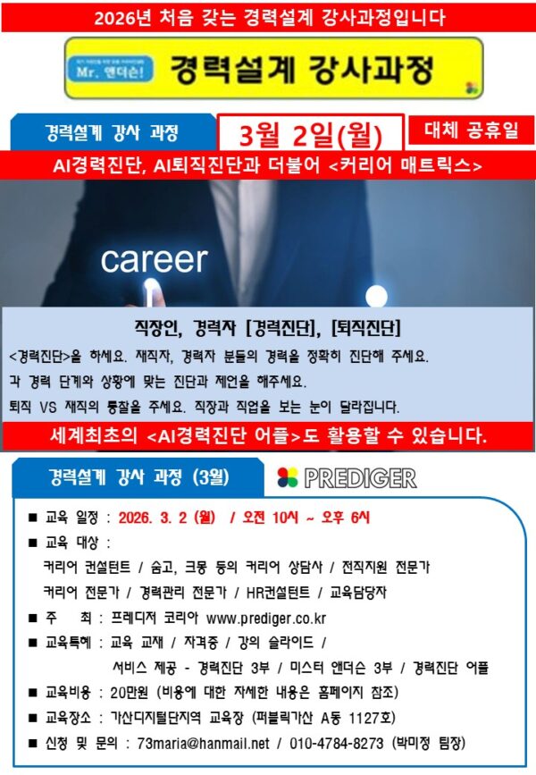 오래 기다리셨습니다. 2026년 들어서 처음 갖는 경력설계 강사과정입니다.