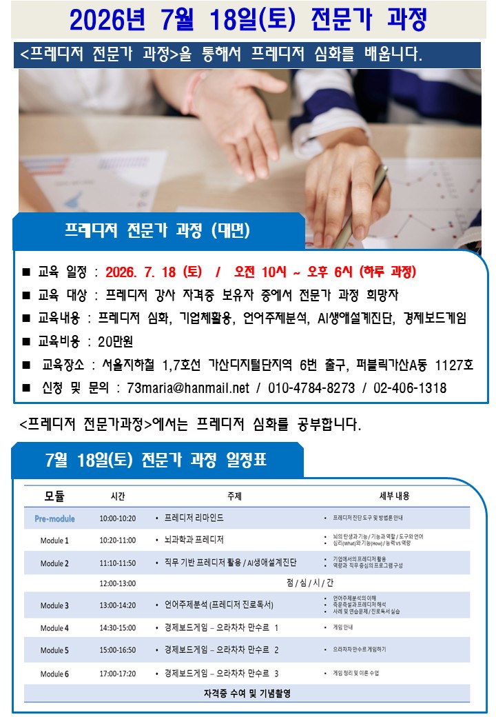 프레디저 전문가 과정은 1년에 2회만 진행합니다.